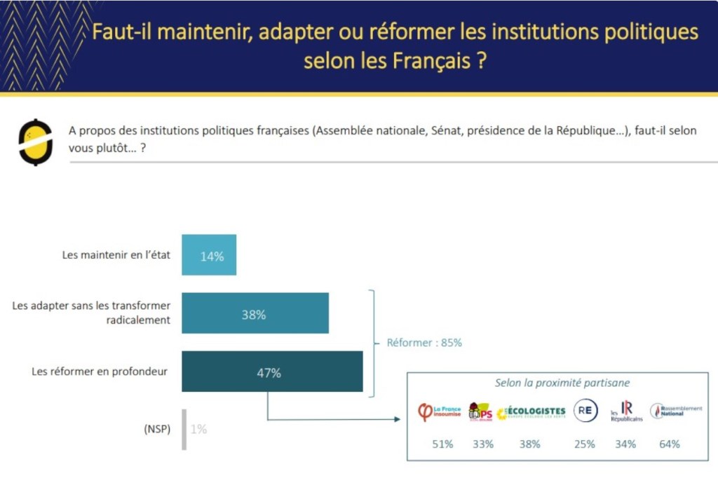 Seuls 14% des français souhaitent aujourd’hui maintenir en l’état nos institutions . Pour 85% de nos compatriotes il devient urgent de réformer en profondeur nos institutions (47%) ou de les adapter sans les transformer radicalement (38%). La classe politique habituellement si attentive à l’opinion et si prompte à s’y adapter pour se positionner par rapport à ses prochaines échéances électorales semble rester sourde à ce constat pourtant accablant : il est probablement plus facile de s’affronter dans de vaines querelles politiciennes sur des enjeux secondaires que de se positionner sur l’une des conditions essentielles pour sortir de la véritable crise institutionnelle que connait la France en ce moment : il est vrai que ces réformes souhaitables et voulues par le français remettraient en question la stabilité confortable des privilèges qui permettent à beaucoup de nos élus nationaux de ce chamailler bruyamment aux frais du contribuable en esquivant les réformes structurelles qui pourtant s’imposent aujourd’hui au vu de l’état de notre société.